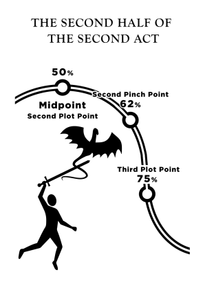 The Second Half of the Second Act begins with the Midpoint at the 50% mark (which we discussed in last week’s post). It is divided in two by the Second Pinch Point at the 62% mark (which we will discuss below). And it ends with the Third Plot Point at the 75% mark (which we will discuss in a few weeks).