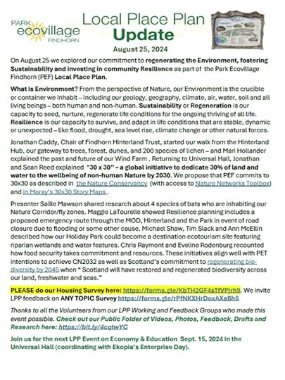 This is a series of Infographics that share the journey of the 4 Voices of the Park Ecovillage Findhorn, Scotland. The stories follow them as they explore integral perspectives while they collaborate on preparing a Local Place Plan to deliver to Moray municipality. The articles were originally published in the Rainbow Bridge – the Park Ecovillage Findhorn Community Magazine between June and September 2024.