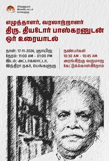 பெங்களுரு விஷ்ணுபுரம் இலக்கிய வட்டம் சார்பாக எழுத்தாளர், திரைப்பட வரலாற்றாளர், சூழியல் எழுத்து முன்னோடி திரு.தியடோர் பாஸ்கரனுடன் ஓர் உரையாடல் ஏற்பாடு செய்துள்ளோம். எ