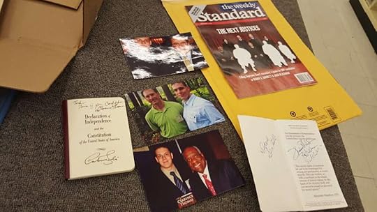 I walked around the ground and saw Justice Samuel Alito. He was wearing a polo shirt. I was star struck. We chatted for a few moments, and I sheepishly asked for a picture. I also asked the then-Junior Justice to sign my pocket Constitution, which he did. I continued to walk around and I found the host of the party Ted Olson. I don't remember exactly what I said, but I recall thanking him for hosting us at his palatial home. He was very gracious. I asked Olson if he too would sign my pocket Constitution. Olson gladly did. And, for good measure, I saw Judge Dave Sentelle. He too signed that Constitution. That Constitution now hangs on the wall in my office, alongside another Constitution that is signed by Justices Thomas and Scalia. These are among my most prized possessions.