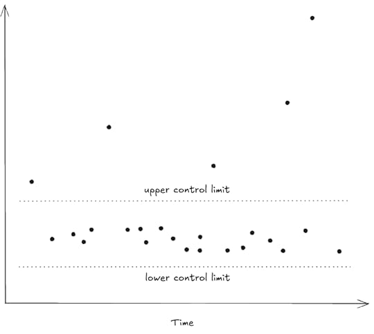 One of the topics Deming wrote on was about a process being under statistical control, with the focus of his book being on manufacturing processes in particular. For example, imagine you’re tracking some metric of interest (e.g., defect rate) for a manufacturing process.
