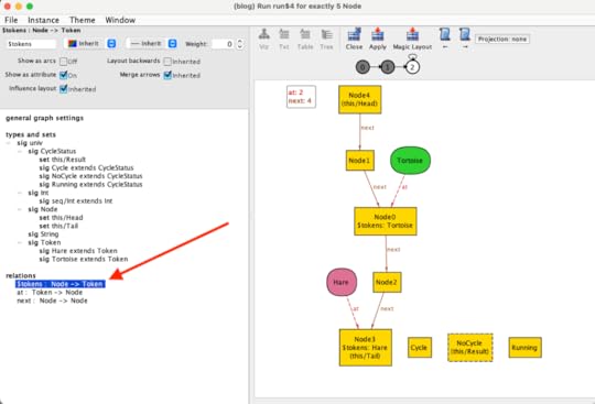 However, Alloy lets you define a function that returns a Node -> Token relation, and then the visualizer will let you treat this function like it’s a field. This relation is just the inverse of the at relationship that we defined on the Token signature: