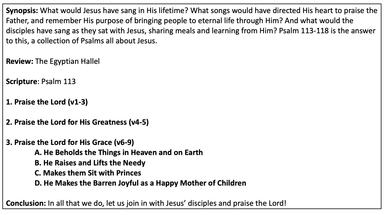 Thanks for digging into the riches of Psalm 113 with me. Next week we’ll continue our study of the Egyptian Hallel with Psalm 114, so you might want to read ahead.