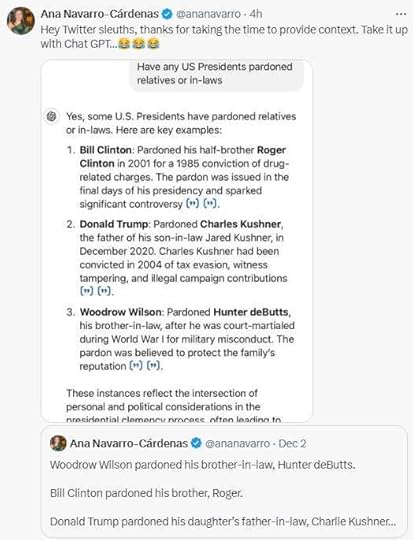 Isaac Schorr (Mediaite) reports that "The View's Ana Navarro-Cárdenas" posted a tweet defending President Biden's pardon of his son by stating, among other things, "Woodrow Wilson pardoned his brother-in-law, Hunter deButts." But apparently Wilson's never had or pardoned a brother-in-law with that name, Schorr reports. And Navarro-Cárdenas' defense (after being called on her original post by Twitter users) seems to be to point to ChatGPT: