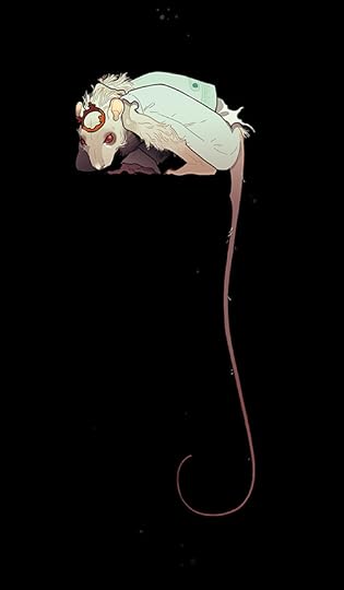 Description: An illustration of the Rat King from THE NUTCRACKER. He is crouched down towards the top of the illustration with his tail hanging down. Cast in pale colors, except for his red eyes and bright crown, against a black background.