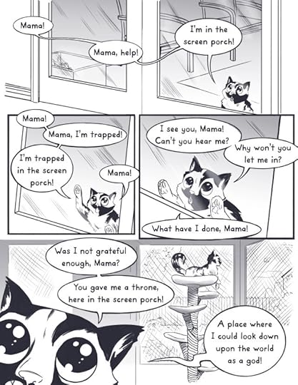 Panel 1: A small tortoiseshell cat sits on the other side of a glass door, looking up sadly, saying, “Mama! Mama, help! I’m in the screen porch!”