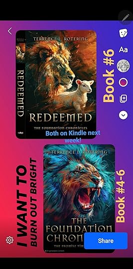"Redeemed" (Book #6) and the full "The Foundation Chronicles" (The Promise, Time, and Redeemed) went to press today. Should be on Kindle next week ($2.99/$9.99) and on paper in February.