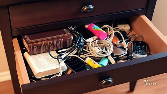 Not my actual nightstand. If it were, you would see embarrassingly fun things alongside the bubble bottles. This graphic is also AI-generated, which would explain the Bible-looking book needing to be charged and no cracks on the old phone’s screens.