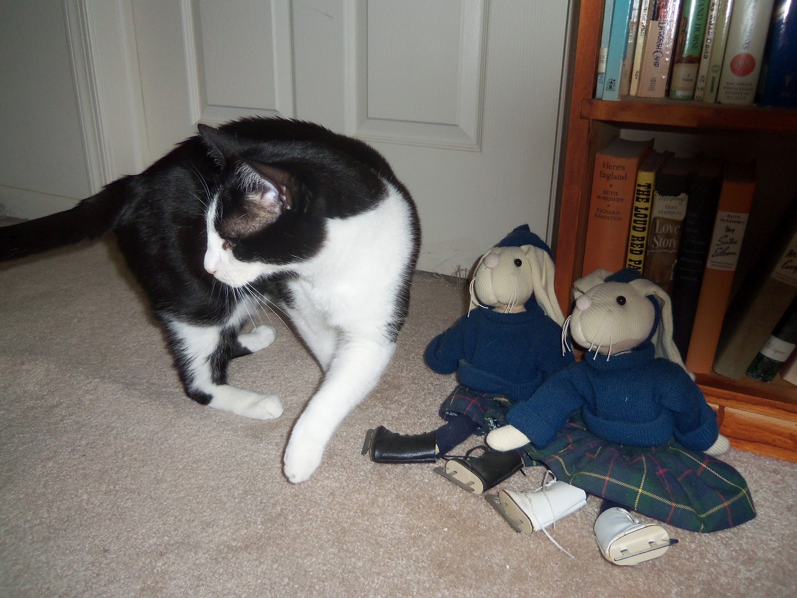 In honor of the announcement, I tried very hard to get Scooter to pose with the figure skating bunny rabbits, but as you can see, he wasn't interested. Actually, he was kind of annoyed because I closed the closet door, which he was considerably more interested in than triple lutzes and the suchlike.Spellcheck, by the way, doesn't approve of lutzes or toeloops, or axels. Guess what. It doesn't like salchows either.