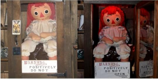 For some reason, the makers of the film didn’t feel the genuine Annabelle doll, seen here with Lorraine, looked scary enough and decided upon a new design. I honestly can’t think why.