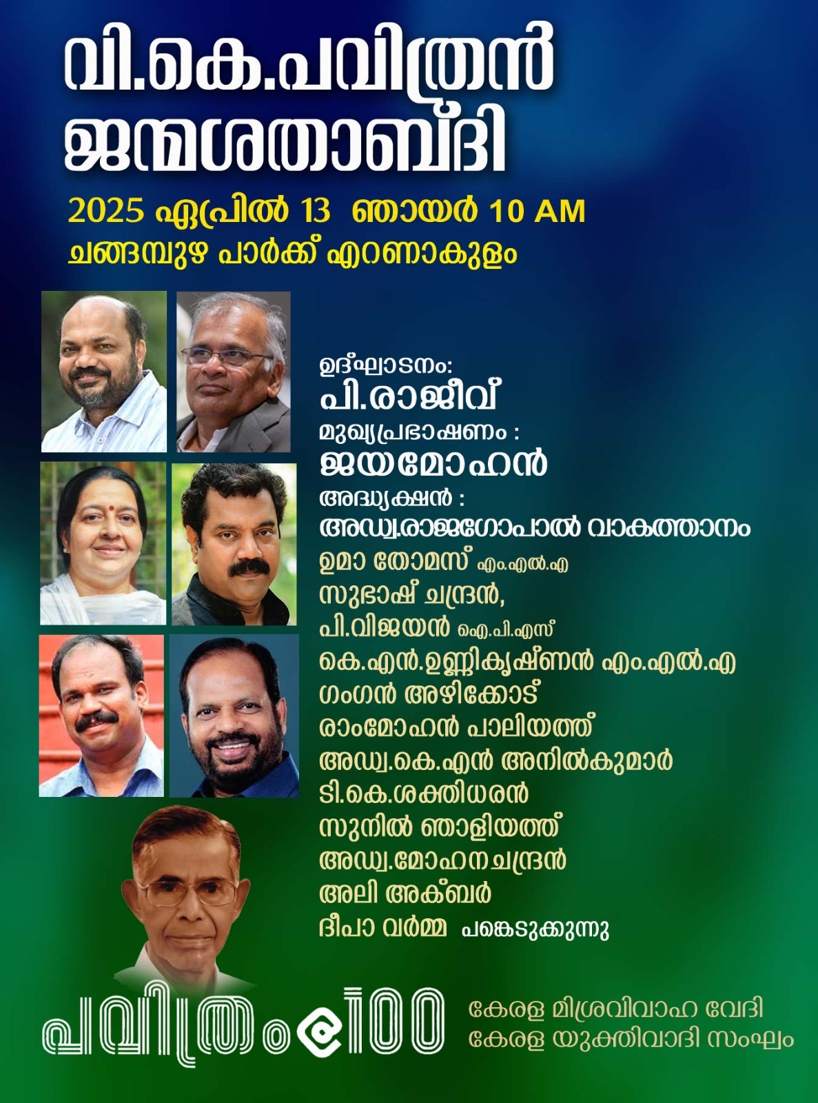 13 ஏப்ரல் 2025 அன்று எர்ணாகுளத்தில் ஒரு நிகழ்வில் கலந்துகொள்கிறேன். வி.கே.பவித்ரன் என்னும் அறிஞரின் நூற்றாண்டுவிழா. கேரள கலப்புத்திருமண சபை, கேரள பகுத்தறிவாளர் சங்கம் ஆகிய அமைப்புகளை உருவாக்கி முன்னெடுத்தவர். கேரளத்து இறைமறுப்பாளர்களில் முன்னோடியானவர். எம்.கோவிந்தன், பி.கே.பாலகிருஷ்ணன், எம் மனோகர் லோஹியா போன்றவர்களின் நண்பர். இடம் சங்கம்புழா பார்க் எர்ணாகுளம். பொழுது காலை 10 மணி