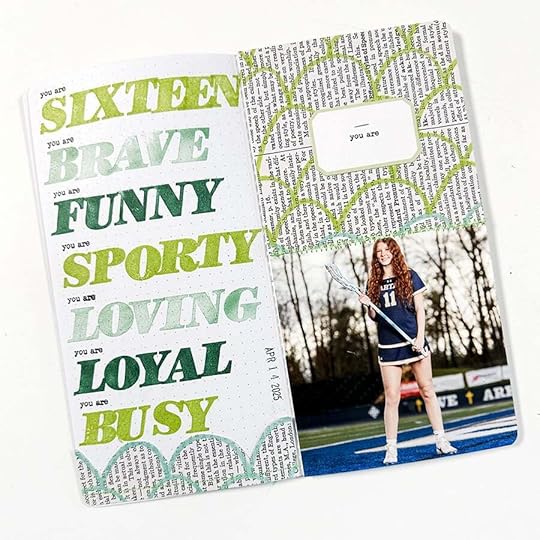 For this project I grabbed a few pattern papers from my stash (from the first and second Storyteller Kit and some floral vellum) and a pack of die cut labels. I'm setting up a formula for myself to follow for each of my entries with pattern paper + a label + the prompt stamp.