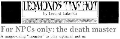 Still, the presentation of Len Lakofka's death master class in issue #76 (August 1983) went above and beyond those of most other classes in terms of making it clear that it was intended only for NPCs. You can see the title of the article in which it appeared above. In addition to the "For NPCs Only" phrasing, there's the subtitle that calls the class a "monster" and notes that one shouldn't consider playing as a death master. Even more notably, the article itself begins with an "Introduction/Sermon" where Lakofka opines