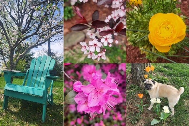 My outdoor reading space is pretty simple. I have a small patio with a fire pit and a side table that overlooks my flower garden on one side and a pair of miniature apple trees behind it. The photo above shows several of my flowers in bloom around my yard (including my pug, Waffles, photobombing in the tulips!) and the beautiful blossoms on my Gala apple tree.
