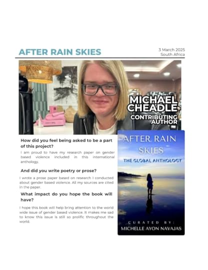 Picture caption: a visual representation of Michelle’s interview with Arshein which you can read in full here: https://michnavs.wordpress.com/2025/03/02/arshein-deticio-for-for-after-rain-skies-the-global-anthology/Picture caption: a visual representation of Michelle’s interview with Michael Cheadle which you can read here: https://michnavs.wordpress.com/2025/03/03/michael-cheadle-for-after-rain-skies-the-global-anthology/