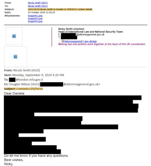 This is one of a series of heavily redacted emails seen by the Guardian, Middle East Eye and lawyers for Palestine Action.  They show the Israeli government being granted direct influence with UK police and prosecutors, to urge the prosecution of UK citizens protesting in the UK, against a genocide for which Israel stands accused at the International Court of Justice, with her leaders indicted before the International Criminal Court.