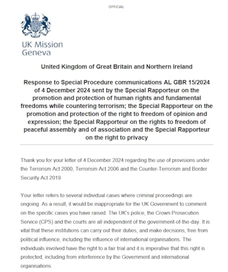 You will recall that I am among a number of journalists about whose detention under the Terrorism Act and the seizure of whose electronic equipment, and thus correspondence, the United Nations interrogate the UK. You can read the UK government reply in full here.