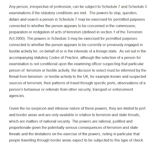 I was detained and my electronics seized under Section 7. That means the UK government is claiming that I was “concerned in the commission, preparation or instigation of acts of terrorism”. Just digest that for a moment.