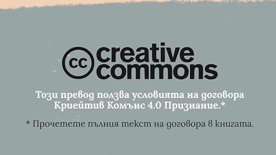 Нещо повече – цялата книга, включително изображението като цяло на предната корица, ползва условията на този договор. Да оставим настрана въпроса „защо“ съм лицензирал превода по този начин. Да се фокусираме „какво“ може да направи един креативен човек (включително и умелите в търговските начинания) с така лицензирано литературно произведение. В какви други сфери на изкуството, културата и по-прозаичния живот автоматично би имал правото да надгражда, модифицира, споделя.