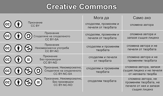 „Криейтив Комънс“ (Creative Commons или CC) е американска организация с нестопанска цел (и международна мрежа), посветена на образователния достъп до и разширяването на гамата от творчески произведения, достъпни за надграждане (и/или създаване на техни производни) и свободно (в рамките законното) споделяне. Организацията има сайт, където можете да се информирате подробно за дейността ѝ.Договорите Криейтив Комънс (the Creative Commons licenses) – и тук вече ще препиша от българската Уикипедия – „представляват сборник от типови договори за използване на авторски произведения“. „Ако в основата на повечето закони за авторското право стои постановката „всички права са запазени“, то особено за договорите Криейтив Комънс е, че „някои права са запазени“. Така например всички разновидности на договорите КК дават възможност на потребителите свободно да копират, разпространяват, представят публично или да използват по друг начин произведението с некомерсиални цели. Някои от разновидностите на договорите позволяват включително и свободно комерсиално използване.“ (За да сме напълно точни, нека повторим, че тези договори уреждат права – авторски права, и по-точно кои аспекти на авторското право върху така лицензираното произведение са запазени и кои по подразбиране отдадени на възприемателя/ползвателя на произведението.)Ясно се вижда кое най-вероятно причинява главоболия в широкото и ясно разбиране за „договора“. А именно – че го наричам „договор“, а не „договори“ или „набор от договори“, което произлиза от факта, че всеки един от тях е „договор Криейтив Комънс“ и най-често хората се срещат с него само в един от вариантите му, защото дадено творческо произведение не може да бъде лицензирано под условията на няколко договора Криейтив Комънс едновременно.