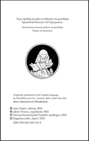 Няколко последни думи за АлисаТъй като „Приключенията на Алиса в Страната на чудесата“ – оригиналният английски текст, както и оригиналните илюстрации от първото му издание от 1865 година – отдавна са в публично достояние, решението да лицензирам превода на български беше относително лесно. Книгата е общодостъпна на английски, защо да не бъде така и на български? Изключително се радвам, че издателство „Ерго“ се включиха в може би рискованото начинание да я издадат под условията на този лиценз, и това недвусмислено е указано в редакционното ѝ каре на стр. 2: