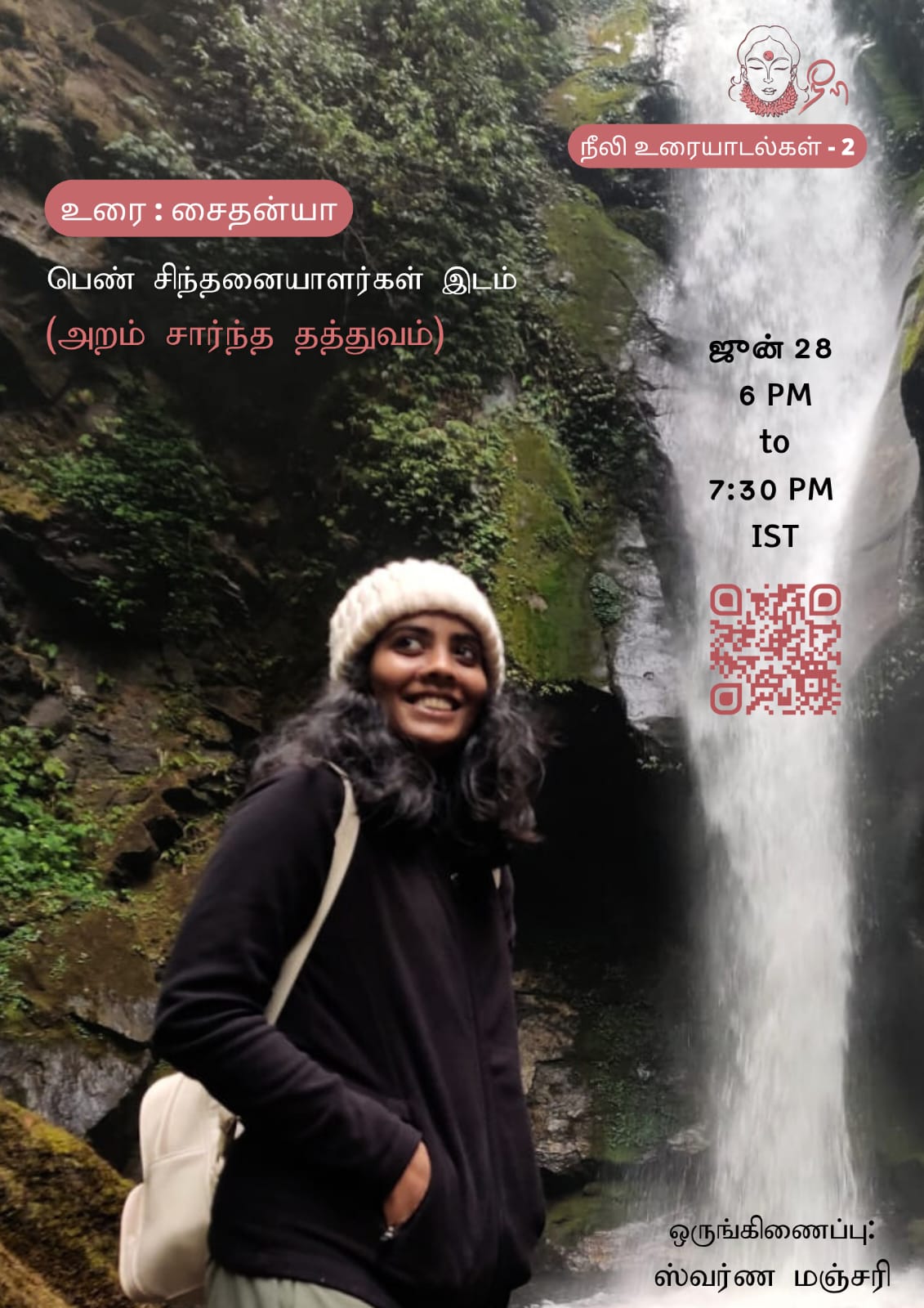 நீலியின் இரண்டாவது கலந்துரையாடல் நிகழ்வு ஜுன் 28 (சனிக்கிழமை), மாலை 6-7.30 வரை நிகழ உள்ளது. இந்த நிகழ்வில் எழுத்தாளர் சைதன்யா “பெண் சிந்தனையாளர்கள் இடம் – அறம் சார்ந்த தத்துவம் (ethical philosophy)” என்ற தலைப்பில் 30 நிமிட உரை நிகழ்த்துகிறார். அதன்பிறகு ஒரு மணி நேர கேள்வி–பதில் அரங்கு நிகழும். இதில் கலந்து கொள்ளும் நண்பர்கள் சைதன்யா நீலியில் எழுதிய கட்டுரைகளை வாசித்துவிட்டு வந்து உரையாடலாம்.