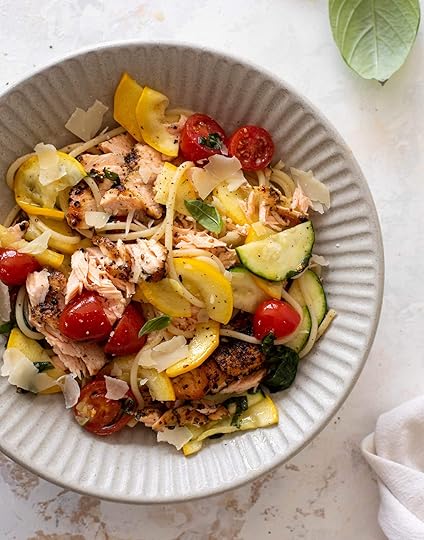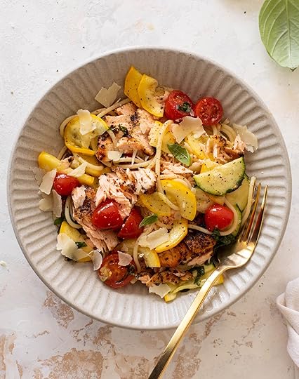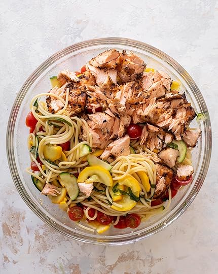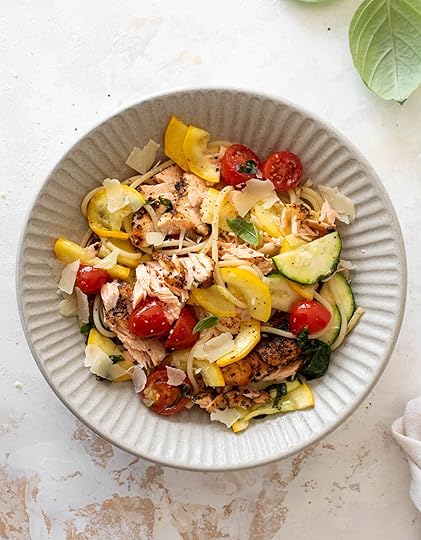 fresh basil, for toppingInstructionsIn a large bowl, combine the zucchini, squash, tomatoes, garlic and basil. You want a large bowl for this because we’re going to add the pasta directly to it later. Add in a big pinch of salt and pepper, the crushed red pepper, olive oil and lemon juice. Cover and let sit at room temperature for 30 minutes or even up to 2 hours.Bring a pot of salted water to a boil. Boil the pasta according to the directions. While you’re waiting for the pasta to boil, start the salmon so both the salmon and pasta can be done around the same time.Preheat the grill to your highest setting. Season the salmon all over with the salt and pepper. Stir together the parsley, basil and garlic powder. Sprinkle it all over the salmon too.Once the grill is hot, place the salmon right on the grates. Grill for 2 to 3 minutes, then use a spatula to gently flip the salmon. Grill for 2 to 3 minutes more, or a little more if you have thick pieces of salmon. You want it to be opaque and easily flake with a fork. We’re going to flake the salmon for the pasta, so you can slice into the center and see if it’s done without worrying about ruining the presentation.Once the pasta is done, drain it and immediately add it to the marinated vegetables. Toss well. Flake the salmon with a fork and add it in too. If you need a big more olive oil, you can add that now as well.Toss well until everything is combined. Taste and season more if needed. Sprinkle on the parmesan and fresh basil. Serve!