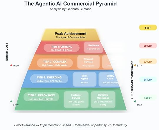 Error tolerance inversely correlates with implementation speed, but market opportunity grows exponentially with complexity—this fundamental principle is driving a methodical, tier-by-tier deployment of AI agents across industries.