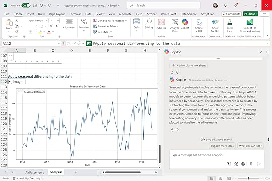 Checking for stationarity and performing seasonal adjustmentsAt this point, Copilot has shown us that our dataset has strong seasonal patterns, which could make forecasting challenging if left unaddressed. With this next prompt, our goal is to break down the concept of seasonal differencing into clear, non-technical steps. This helps Excel users grasp exactly how adjusting for seasonality makes the dataset “stationary” for ARIMA to handle effectively.