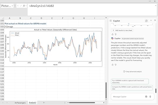 Copilot’s output is exactly what we want: clear, practical, and visual. The dashed orange line (predictions) closely tracks the blue line (actual data), which means our ARIMA model is accurately capturing the pattern in the historical data. This visual check is crucial because it gives Excel users a quick and intuitive way to judge the quality of the ARIMA forecast without needing to dive deeply into complex statistical metrics.