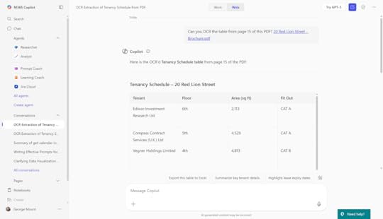 To kick things off, we need a way to pull the table from the PDF into a usable format. There are plenty of options for this, but Copilot at copilot.microsoft.com is a quick and reliable choice. I’ll ask Copilot to run OCR on page 15 of the PDF and upload the file as part of my prompt. From there, Copilot returns the table in a clean, structured format: