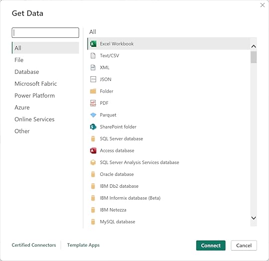 Take the table Copilot gave you and copy it into a CSV file or an Excel workbook. Just be sure to save it somewhere easy to find. Next, open Power BI Desktop and start a blank report. When choosing your data source, you’ll see the most common file types listed at the top, so just pick the one that matches your file and load it in: