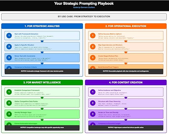The Strategic Prompting Playbook lays out four core use cases: Strategic Analysis, Operational Execution, Market Intelligence, and Content Creation. Each follows a step-by-step prompting flow that transforms AI from a text generator into a structured thinking engine.