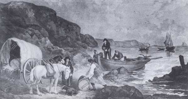 "Smuggling! Oh, the shame of it! Is there no magistrate to hand, no justice of the peace? Is there no clergyman, no minister?"             The naïve visitor's protests were silenced when the locals pointed out it was the vicar holding the lantern. Smugglers on-shore, awaiting the arrival of their load.Of course the incentive for taking part in, or turning a blind eye to, smuggling was financial. At a time when everything from salt to silk, and tea to tobacco was taxed, cutting out the governments share meant people might be able to afford a little comfort in their lives. Such was the way of the world back then, that a little casual handling of illegal goods was looked on as common place, as in this diary entry by Parson Woodforde.            "Andrews the smuggler brought me this night about 11 o'clock a bag of Hyson Tea, 6 lb weight. He frightened us a little by whistling under the parlour window just as we were going to bed. I gave him some Geneva(gin) and paid for the tea at 10/6 a lb." Smuggled goods being transported ashore.