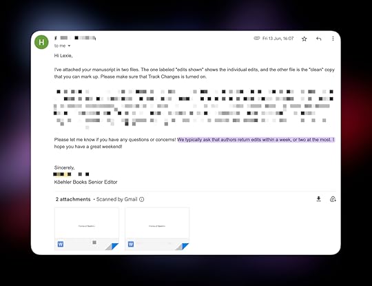 Yeah a lot of it is blurred but the point will stand… We typically ask that authors return edits within a week, or two at most.