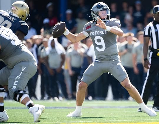 Air Force Falcons quarterback Liam Szarka (9) throws down field against Navy during the first half Saturday, Oct. 4, 2025, at Navy-Marine Corps Memorial Stadium in Annapolis, Md. (The Gazette, Christian Murdock)The Falcons’ offense, behind Szarka and a career day from tight end Bruin Fleischmann, nearly kept pace, coming back to tie the game at 17, 24, and 31 after the Midshipmen kept moving in front.