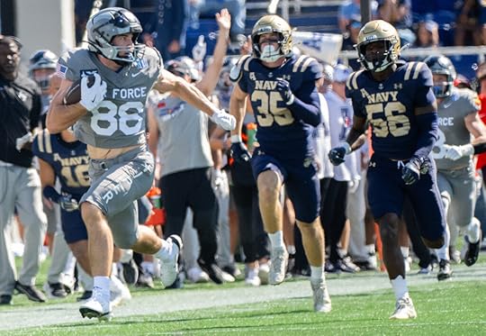 Air Force Falcons tight end Bruin Fleischmann (88) runs down field a head of Navy Midshipmen linebackers Luke Pirris (35) and Marcanthony Parker (56) for a long reception during the first half Saturday, Oct. 4, 2025, at Navy-Marine Corps Memorial Stadium in Annapolis, Md. (The Gazette, Christian Murdock)Fleishmann caught six passes for 166 yards and two touchdowns, more than doubling the 138 career receiving yards he had entering the game. And that was after starting 16 consecutive contests.