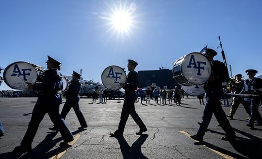 The Air Force Drum and Bugle Corps march in front of the Air Force fans Saturday, Oct. 4, 2025, outside the Navy-Marine Corps Memorial Stadium before the start of the Air Force game against Navy in Annapolis, Md. (The Gazette, Christian Murdock)