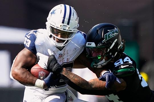 Dallas Cowboys’ Javonte Williams tries to get past New York Jets’ Tyler Baron during the first half of an NFL football game Sunday, Oct. 5, 2025, in East Rutherford, N.J. (AP Photo/Yuki Iwamura)Boo…
