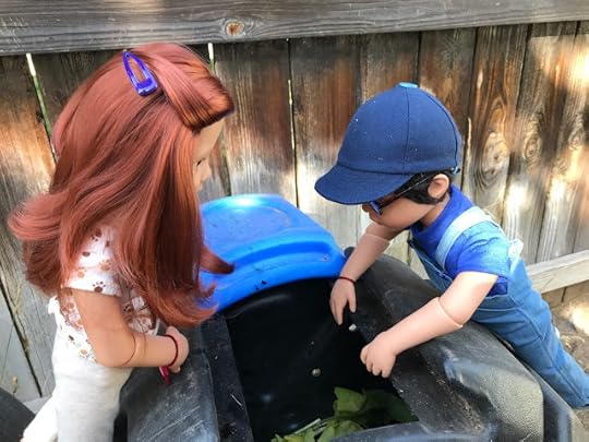 In went the rest of the pieces of vegetables and stuff that was not good to eat or was getting smoochy. When the container was empty, the dolls climbed up to look inside.