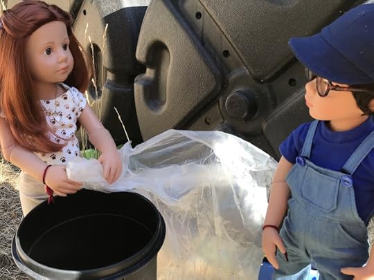 The two dolls put the clean, dry bag into the pail, and Mandy poked it down inside.