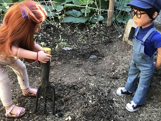 The two dolls walked over to the garden. Mandy used a tool to dig in the soil, so Emil could see what it looked like. It was very dark and crumbly.