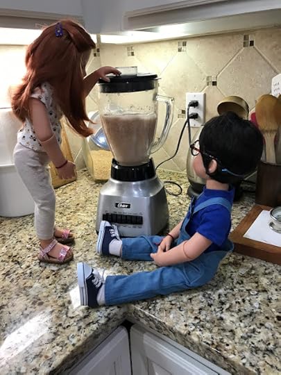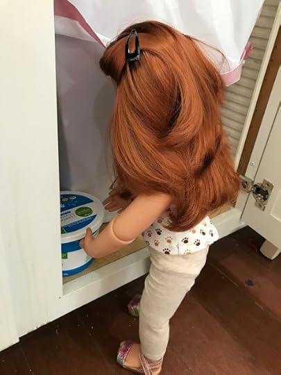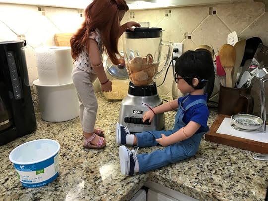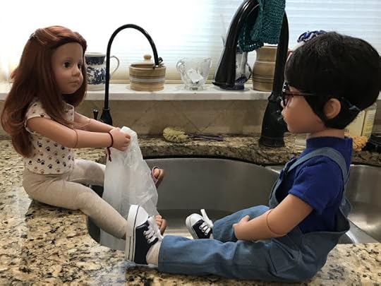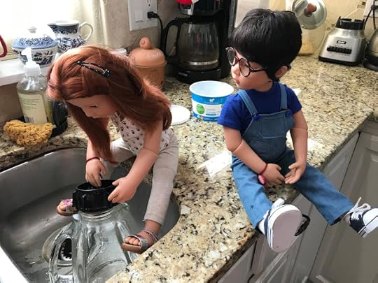 Note to children: Dolls are very small, so to work in the kitchen they sometimes have to get up on the counter. They are very careful to wash the countertops after they are done sitting there or walking around on it. Real children should not be up on the counter, though. It is a surface for using your hands to prepare food.