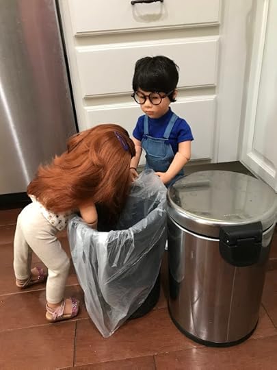 The dolls took the compost container pail and the dirty bag back into the house. They rinsed the dirty bag in the sink.