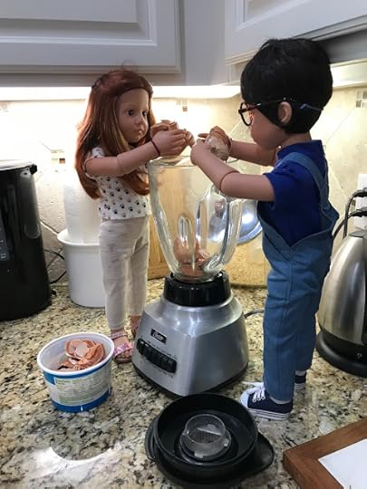 She brought out the little tub with the eggshells, and the two dolls climbed up onto the countertop. They moved the blender out and smooshed the eggshells over the blender container as they dropped them in.