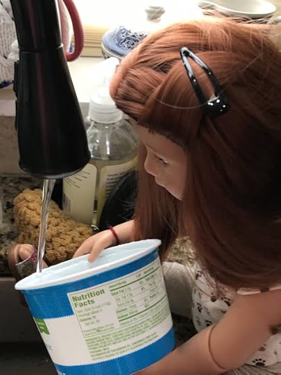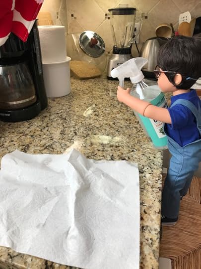 While Mandy was rinsing the eggshell tub, Emil got out the cleaning spray and cleaned the countertop everywhere the dolls had walked, so it would be clean for cooking food again.