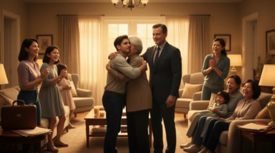 ظل عصام مصابا بالدهشة والحيرةوخالد يأبى أن يوضح له الأمر إلا في المنزل، وفي المنزل اجتمعوا جميعا بناء علىترتيب من خالد، جلسوا جميعا يتهامسون، وكان الجميع يتهامس، مشيرة ومحمود وكمالوالأستاذ رفعت بالإضافة إلى دينا وياسمين ووالدة عصام وخالته. حضر خالد ومعه عصاموبين فرحة غامرة ودهشة مفرطة وأسئلة تنتظر إجابة اتجه الجميع إلى عصام بالتهنئةبينما اتجه هو إلى والدته وارتمى في أحضانها، ثم عانق ياسمين وخالته وعانقت عيناهعيني دينا قبل أن يتجه إليها ليحتضنها بمشاعره. اتجه خالد إلى منتصف الصالة ورفعصوته بدعوة الجميع إلى الانتباه.