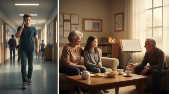 ضحك عصام حتى رجع برأسه إلى الخلفوضحكت والدته، تمالكت صفية نفسها وبدأت تغني وهنا خرجت ياسمين تستمع وجلست بجوارخالتها على الاريكة