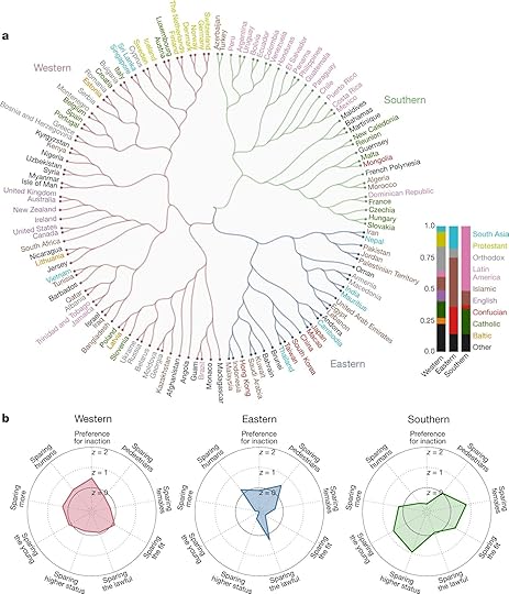 На этом огромном дереве авторы выделили три самых больших группы человеческих популяций. Вот как в биологии есть бактерии, археи и эукариоты, так и тут есть восточный, западный и южный кластеры этических суждений. Хотя это не всегда соответствует географии, что и логично.