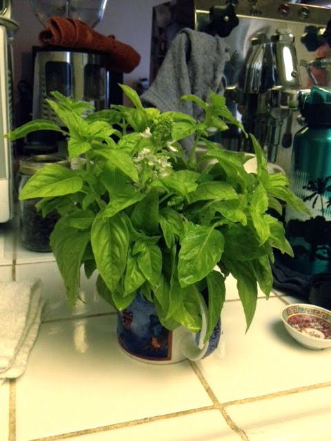 When I got a bunch of basil in our organic co-op basket, I stuck it in a mug of water on the counter and intended to use it within a few days before it got wilty.